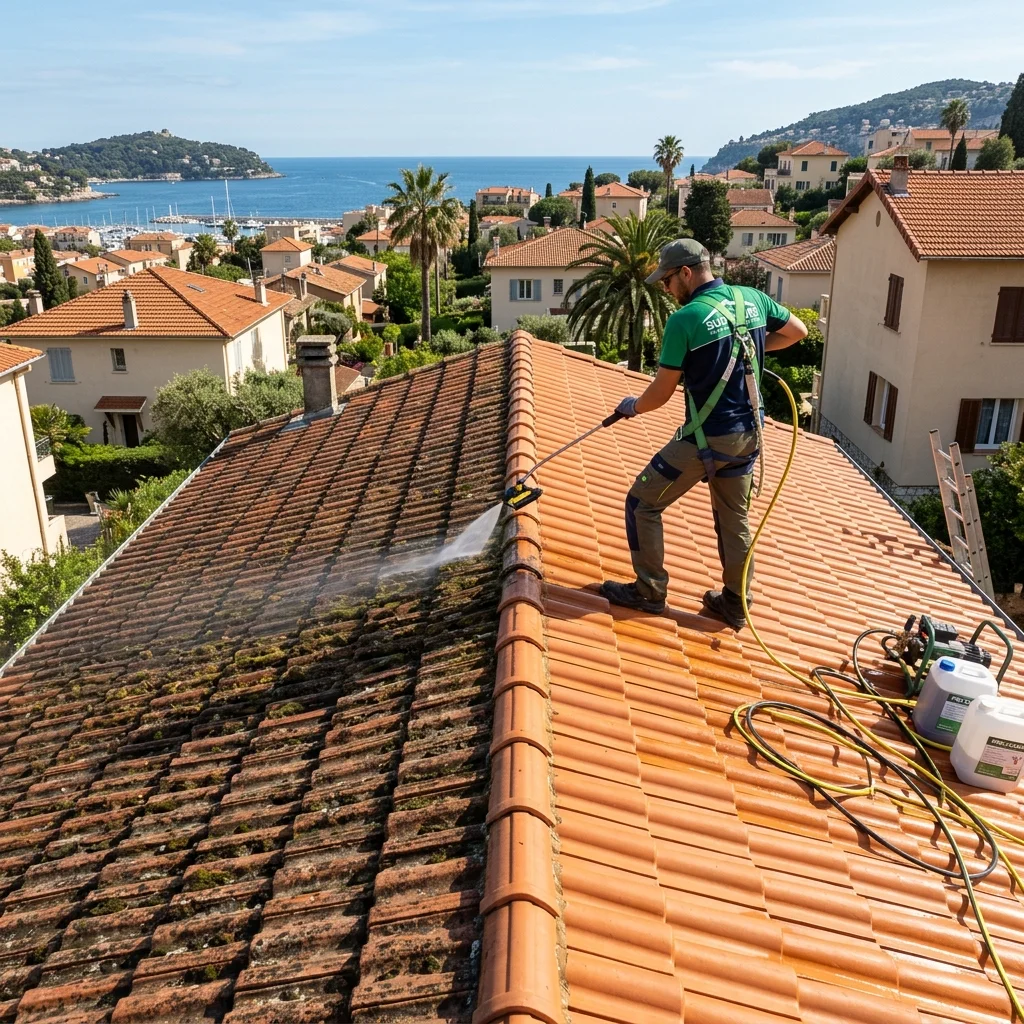 Démoussage et traitement hydrofuge professionnel dans les Alpes-Maritimes. Votre toiture retrouve son état d'origine en moins de 4h — sans karcher.